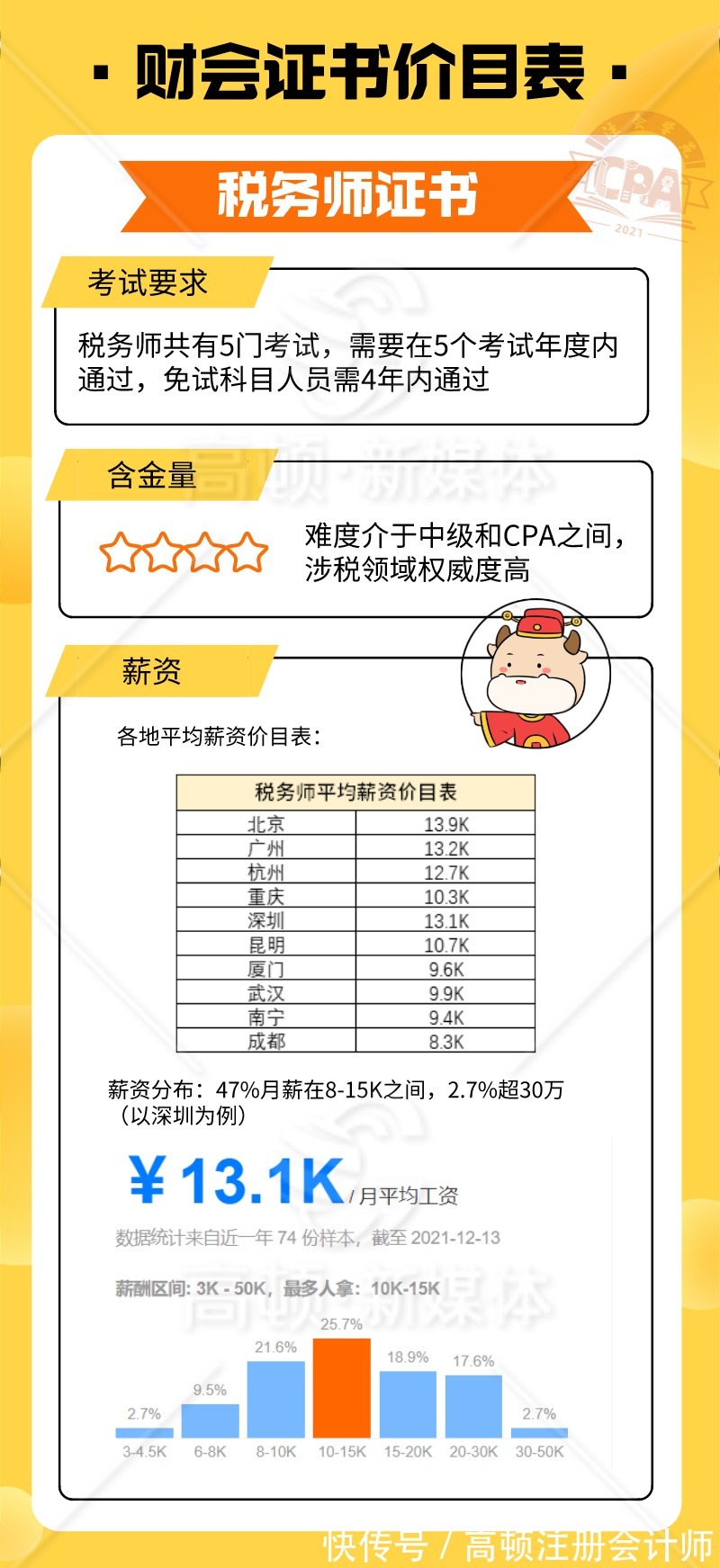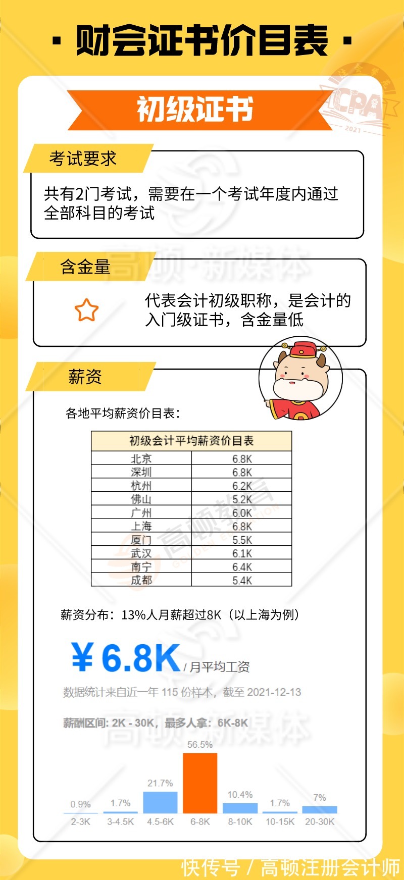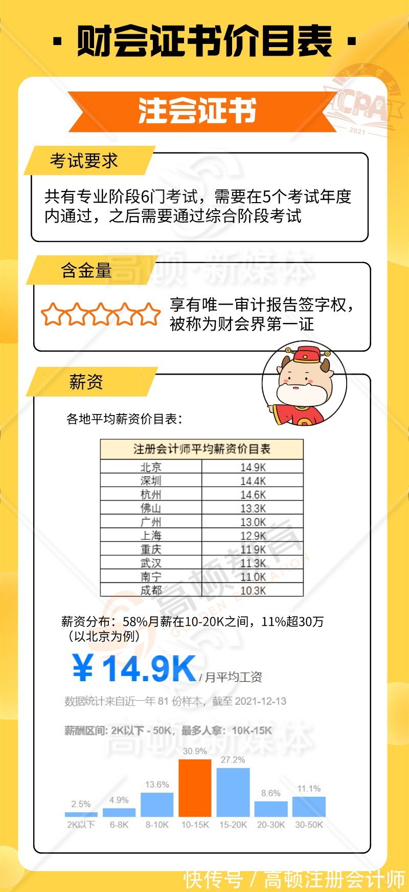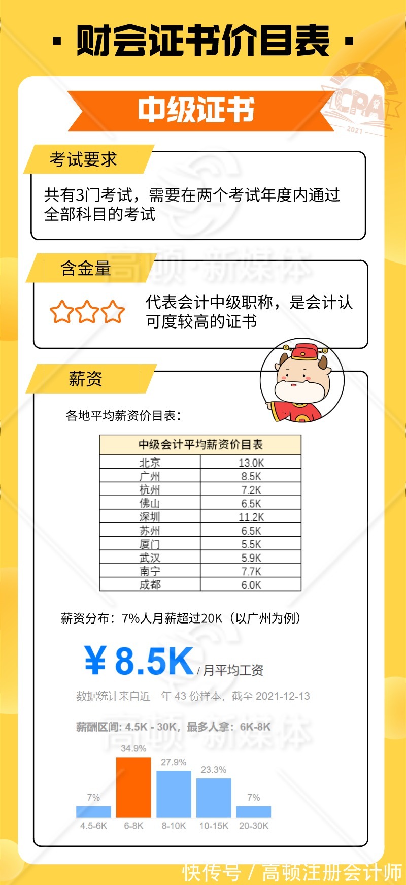 从数据统计来看,持有中级会计的月平均工资在8.5K,但薪酬最多的依然还是在6~8K区间。如果想要薪资更高的话,可能只有拿下下面这本证书:注册会计师。